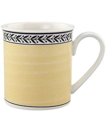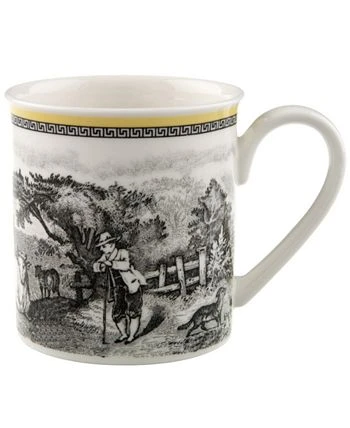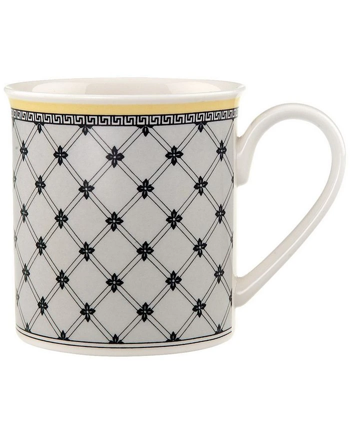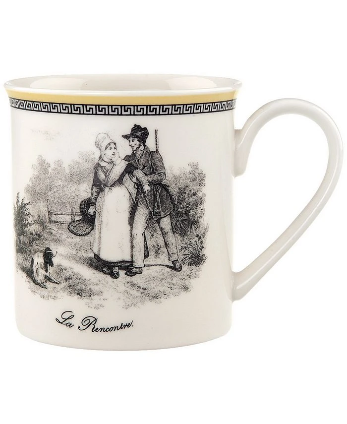 Mix and match, choosing from four patterns of black-and-white French country scenes and designs on white porcelain banded in yellow.