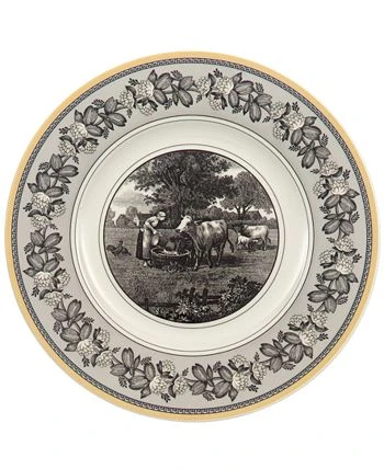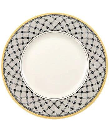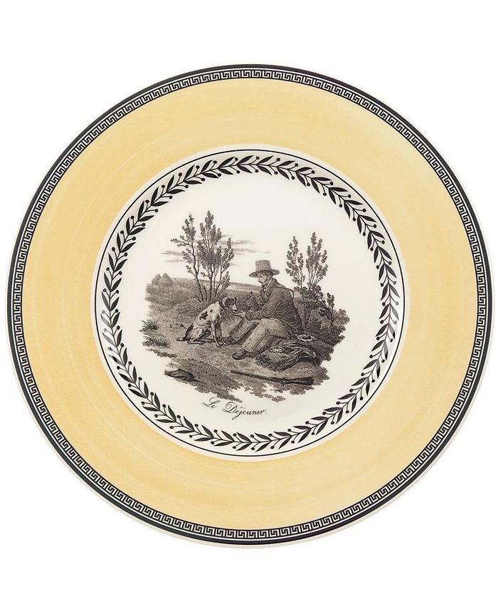 Mix and match, choosing from four patterns of black-and-white French country scenes and designs on white porcelain banded in yellow.