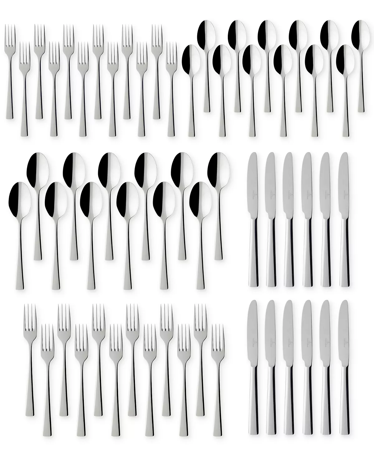 - Includes 12 of each of the following: dinner fork, salad fork, dinner knife, soup spoon & teaspoon