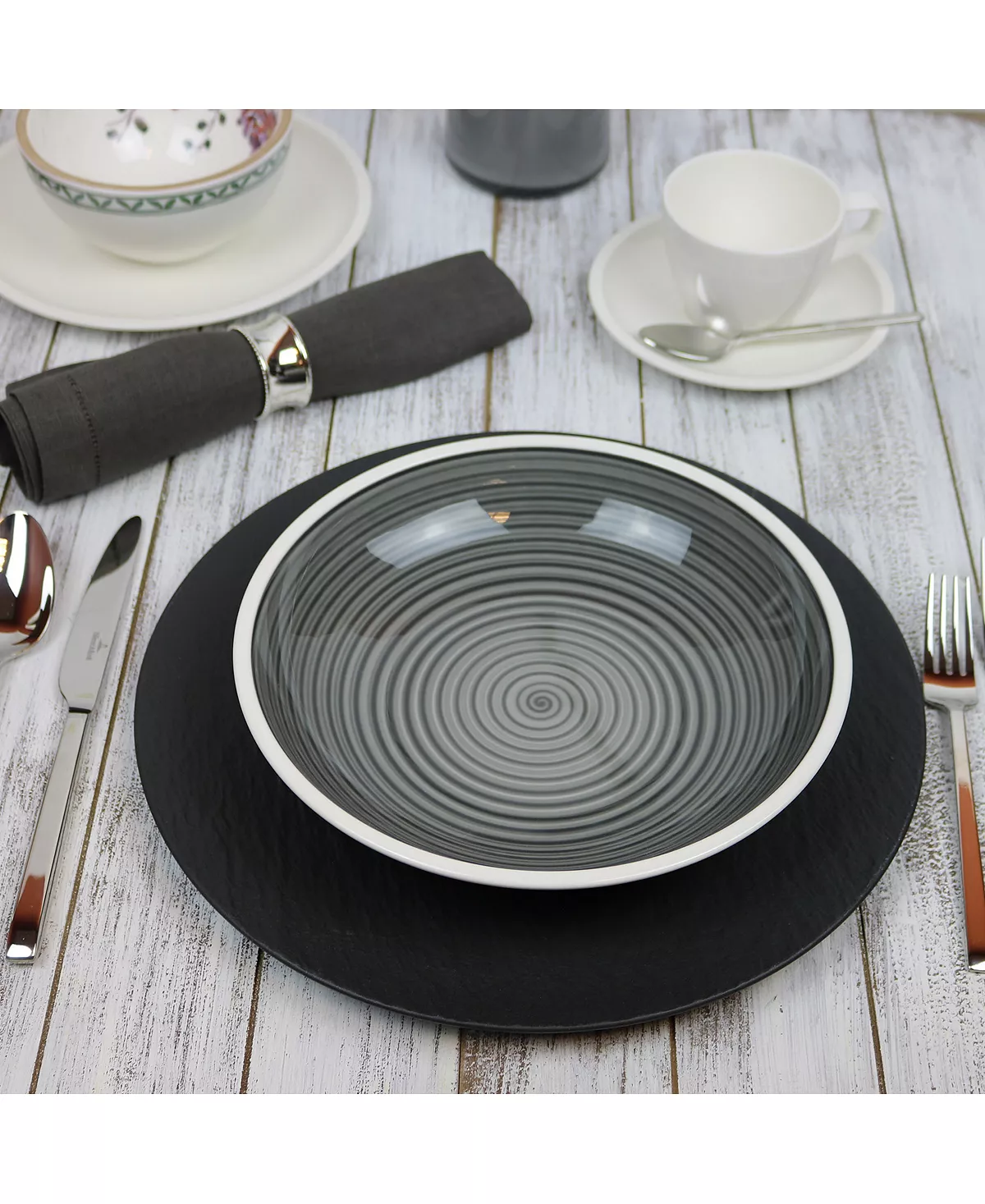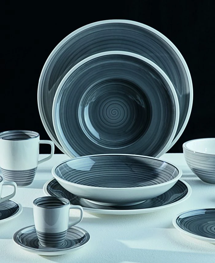 Add a touch of artisanal sophistication to your table with the striped glazing and clean white porcelain of the hand painted Manufacture Gris collection