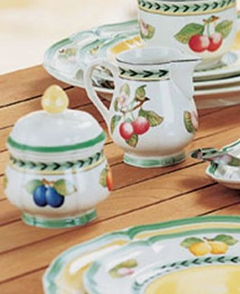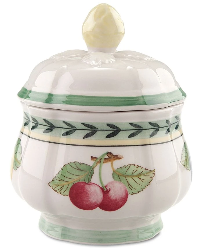 Bring the lush bounty of the French countryside to your table with this vibrant mix-and-match dinnerware collection from Villeroy & Boch. The scalloped shaped sugar bowl has a summer fruit pattern on its border and is set against a creamy white background. Complete your dinnerware service with these stunning serving pieces. Dishwasher- and microwave-safe porcelain. Villeroy & Boch has been creating distinctive tableware since 1748. Made in Germany.