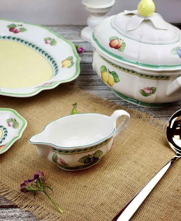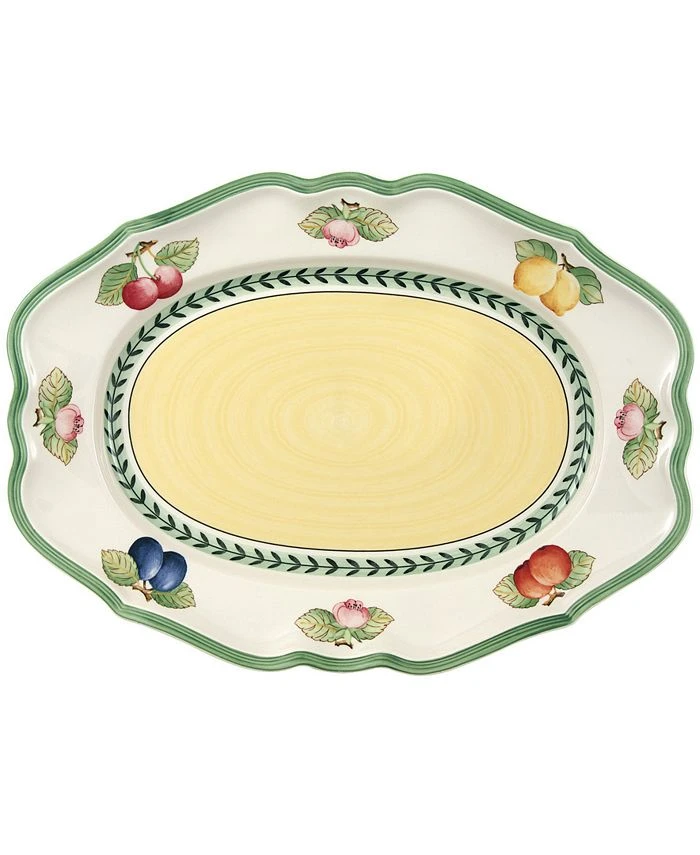 Bring the lush bounty of the French countryside to your table with this vibrant mix-and-match dinnerware collection from Villeroy & Boch. The scalloped shaped oval platter has a summer fruit pattern on its border and is set against a creamy white background. Complete your dinnerware service with these stunning serving pieces. Dishwasher- and microwave-safe Premium porcelain. Villeroy & Boch has been creating distinctive tableware since 1748. Made in Germany.