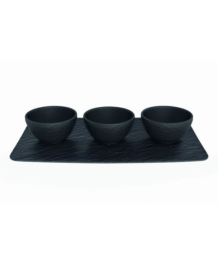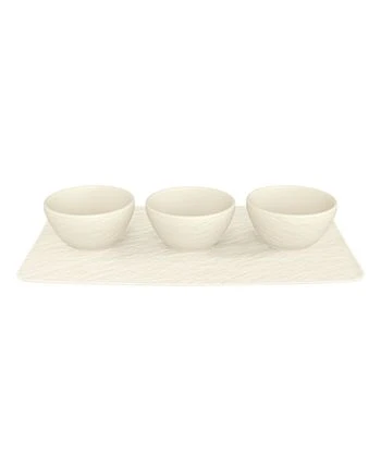 The Manufacture Rock Blanc Dinnerware Collection by Villeroy & Boch lends a contemporary element to your tabletop with its cool slate-inspired design and textural finish. The 4 piece dip set includes 3 dip bowls and one rectagular tray. Endless mix and match options are possible. Villeroy & Boch has been creating sophisticated tableware since 1748. Made in Germany.