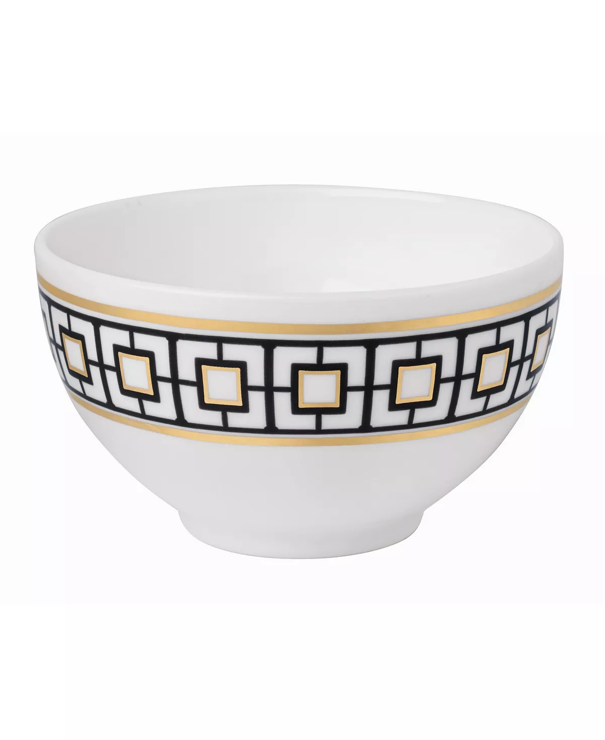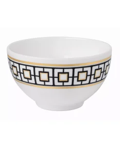 Metro Chic’s geometric pattern features expressive black and 22 karat gold details. The elegant Premium Bone Porcelain adds every table into a memorable design statement of timeless elegance. Dishwasher Safe.